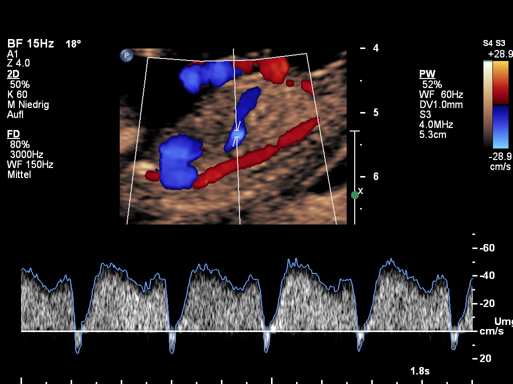 Durch unsere Tätigkeit in einem anerkannten Zentrum wissen wir, dass sich leider nicht alle Schwangerschaften komplikationslos entwickeln. Daher gehört schon zu diesem frühen Zeitpunkt das Screening auf sogenannte Präeklampsie zu einem festen Bestandteil der Untersuchung. Dabei kombinieren wir mütterliche Parameter mit einer Doppleruntersuchung der Placenta und zwei Hormonwerten aus dem mütterlichen Blut (PAPP-A und PlGF). So gelingt uns eine treffende Vorhersage auf diese Komplikation in über 93%. Dieses hat deshalb eine große Bedeutung, weil wir erkannte Risikopatientinnen besonders überwachen und therapieren können, so dass die Wahrscheinlichkeit für Komplikationen deutlich sinkt.